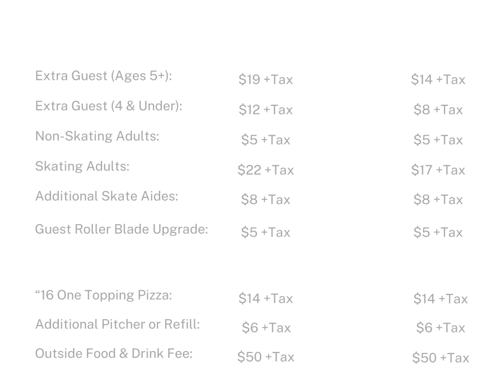 As the party parent, don’t stress over adding additional items to your party immediately. You may call or visit the Skatium anytime before your party or request these items on the day of your party. Additional guests (skating or not) may not be added to any party package until the day of the reservation.